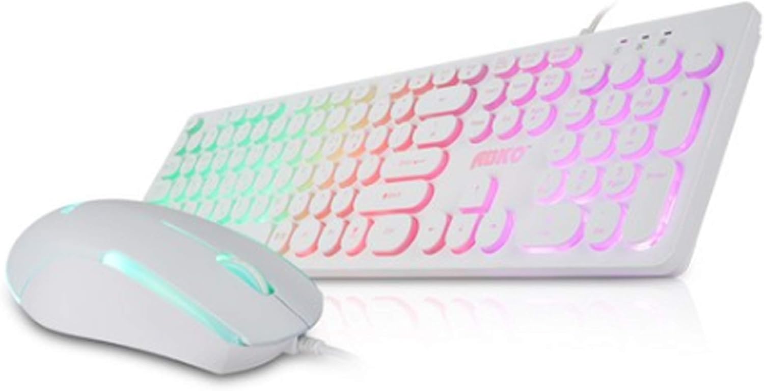 Image: The ABKO KM110 RGB LED Membrane Keyboard and Mouse Set, showcasing the white keyboard with rainbow backlighting and the matching white mouse.