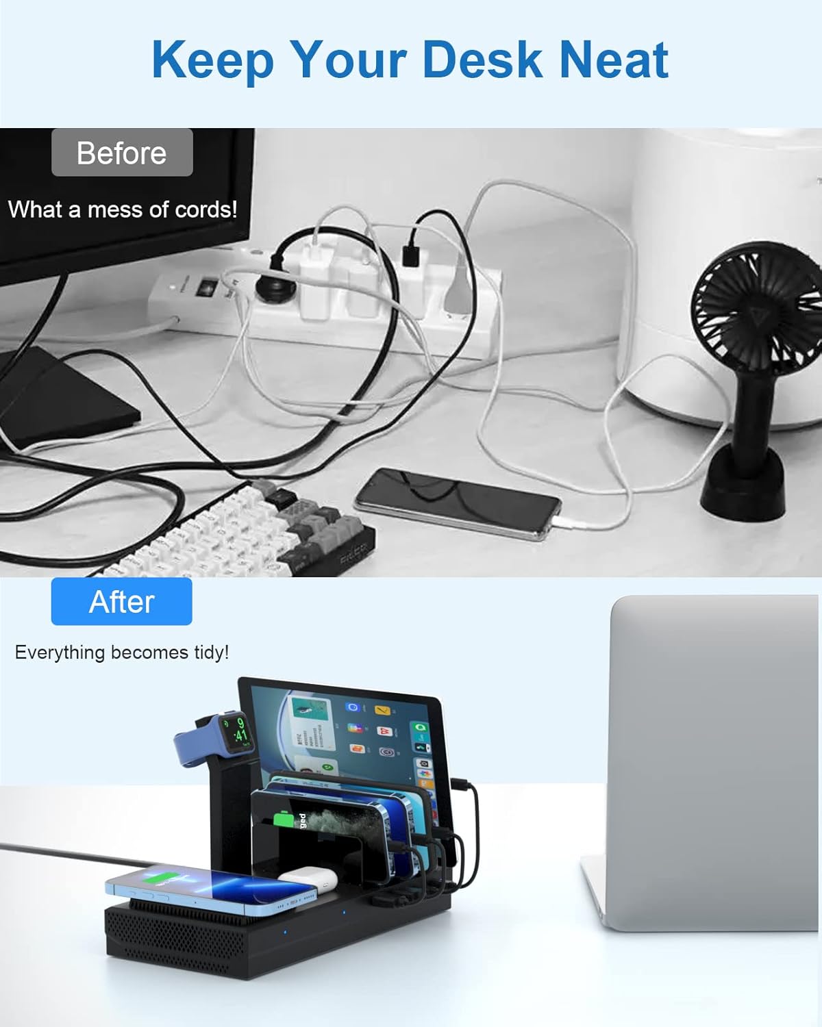 Image showing the NANAMI charging station organizing multiple devices on a desk, contrasting a cluttered setup with a tidy one.