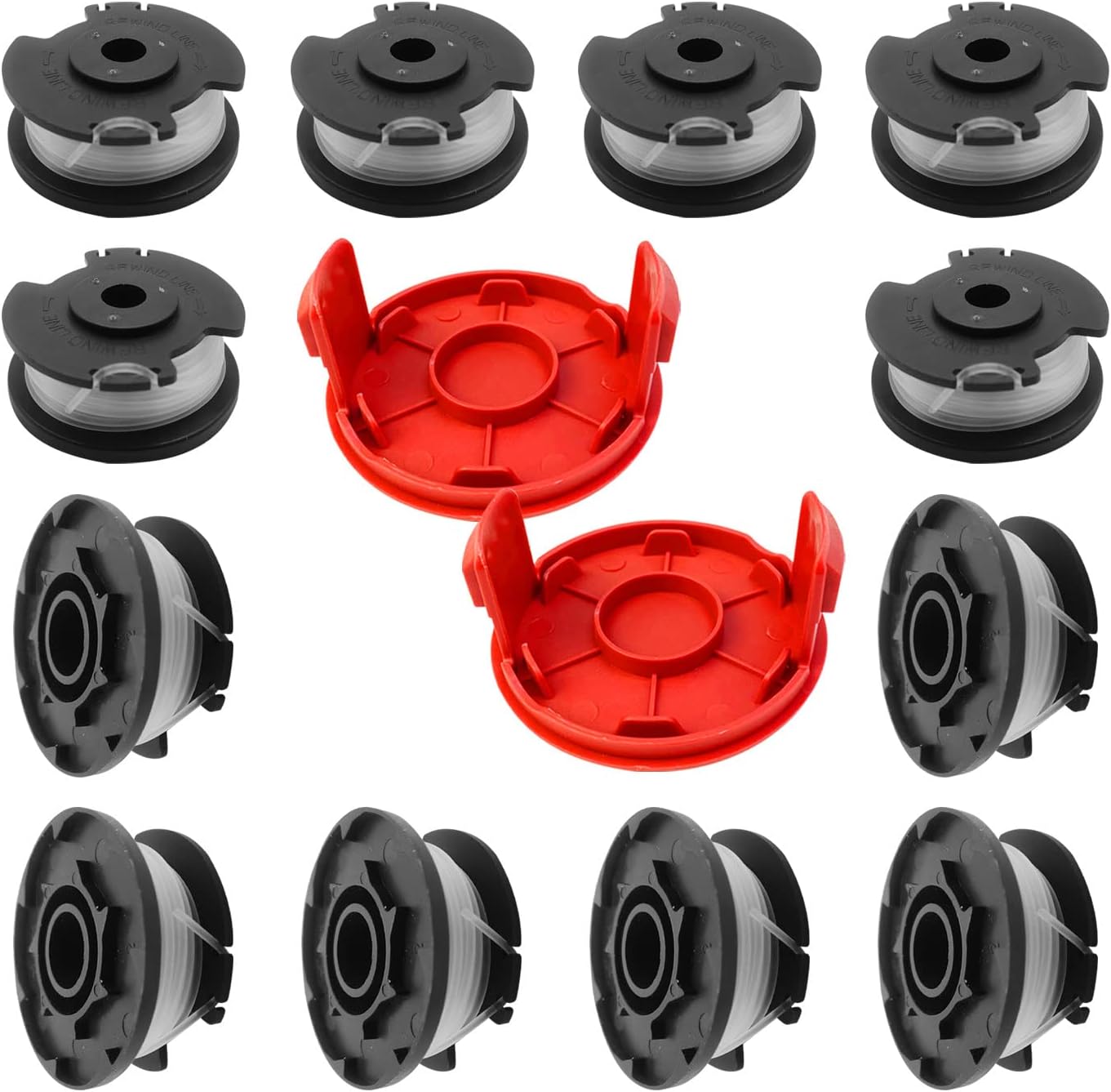 Image: A collection of black replacement trimmer spools, pre-wound with white line, alongside two red replacement caps. This image displays the full contents of the product package.
