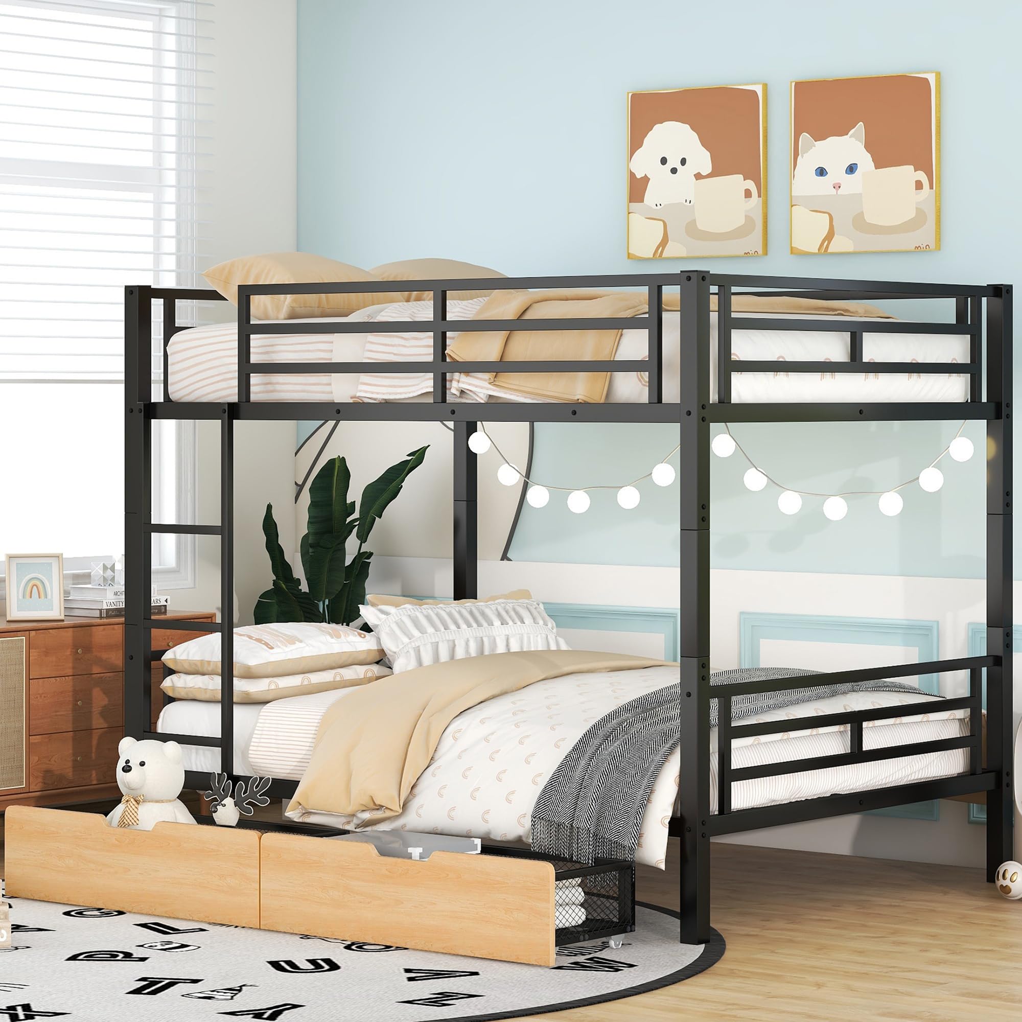 Securely attach the built-in ladder to the bunk bed frame. Assemble the two storage drawers by attaching the wooden fronts to the metal mesh baskets and installing the wheels. Slide the assembled drawers under the lower bunk.