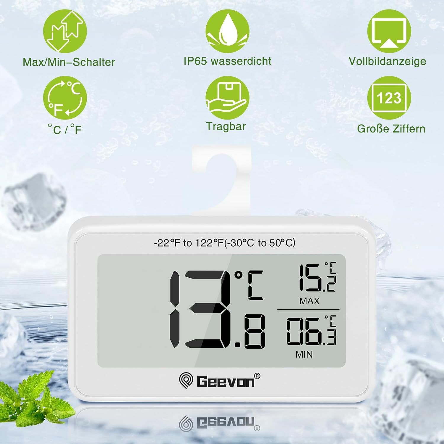Thank you for choosing the Geevon Mini Digital Refrigerator Thermometer. This device is designed to provide accurate temperature readings for your refrigerator or freezer, ensuring safe storage of perishable goods. Its IP65 waterproof rating and user-friendly design make it suitable for various environments, from home kitchens to commercial settings.