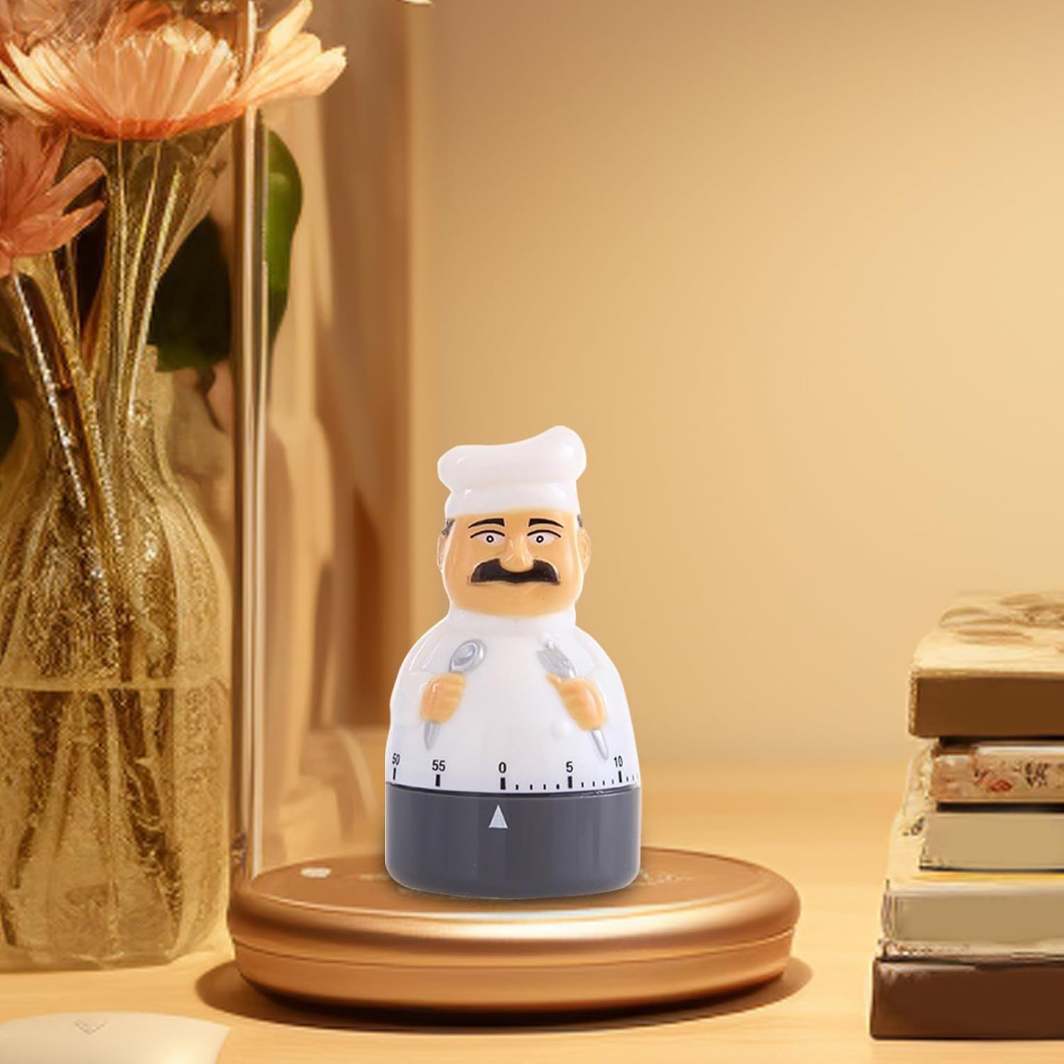 Image 1.1: The Chef Style Mechanical Kitchen Timer. This image shows the timer, shaped like a chef, on a wooden surface. The dial with numbers 0-60 is visible at the base.