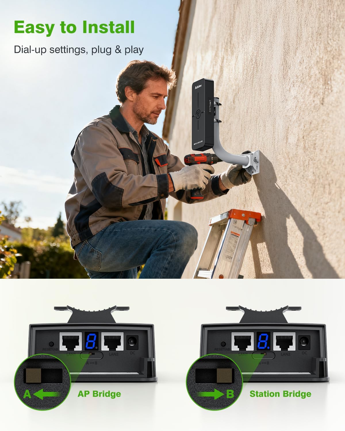 Image: A man installing the AdaLov WiFi 6 Wireless Bridge on the exterior wall of a building.